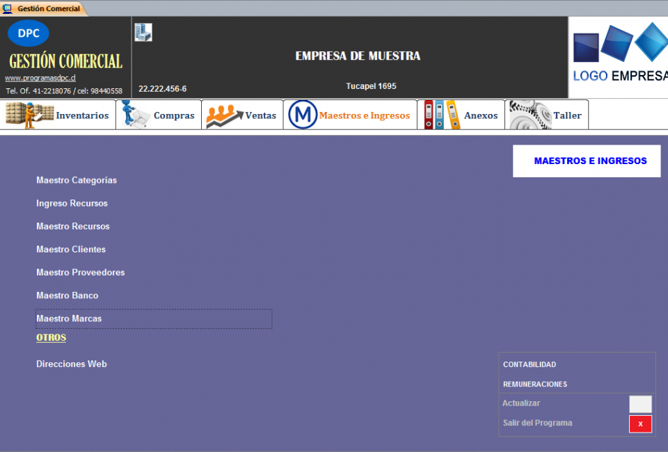 Panel Principal - Pestaña Maestros e Ingresos