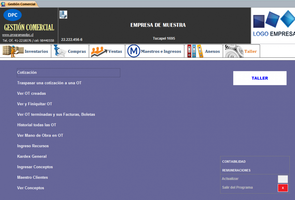 Panel Principal - Pestaña Taller